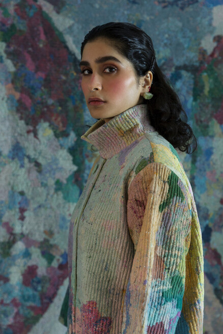 Von Kleidern bis hin zu Oberbekleidung wurde jedes Kleidungsstück mit geliehenen Geschichten versehen, die die Erinnerung an ungenutzte Stoffe und ausrangierte Fäden aus früheren Kollektionen wiedergeben. Diese Erinnerungen, die so einzigartig für jedes Stück sind, würden sonst nicht dokumentiert werden. So wie sich unser Geist an Erzählungen erinnert und die Grenzen der Realität neu erschafft, leiht sich jedes Kleidungsstück von früheren Stücken und Kollektionen aus, hat aber nun seine eigenen Abdrücke und eine besondere Geschichte zu erzählen.