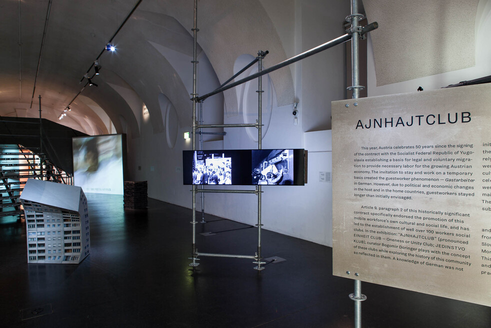 Zur Feier des 50. Jahrestags der Community in Österreich und als Geste der Dankbarkeit gegenüber diesen Frauen und Männern aus der SFR Jugoslawien – nunmehr Slowenien, Kroatien, Serbien, Montenegro, Mazedonien, Kosovo sowie Bosnien und Herzegowina – öffnet der „AJNHAJTCLUB“ (ausgesprochen wie EINHEITKLUB in der Bedeutung JEDINSTVO KLUB) im frei_raum Q21 exhibition space im MuseumsQuartier Wien. Vermittelt durch zeitgenössische Kunst und Forschung soll der „Klub“ die Geschichte dieser MigrantInnen mit ihrer heutigen Situation verbinden und so einen Ausblick in die Zukunft ermöglichen. Obwohl man sie fast nur noch von alten Schwarzweißfotos kennt, gibt es GastarbeiterInnen bis heute. Die Ausstellung ist ein buntes Panorama dieses Phänomens, das bis zu dreidimensionalen Avataren, moderner Folklore, interaktiven Performances und Interventionen reicht.