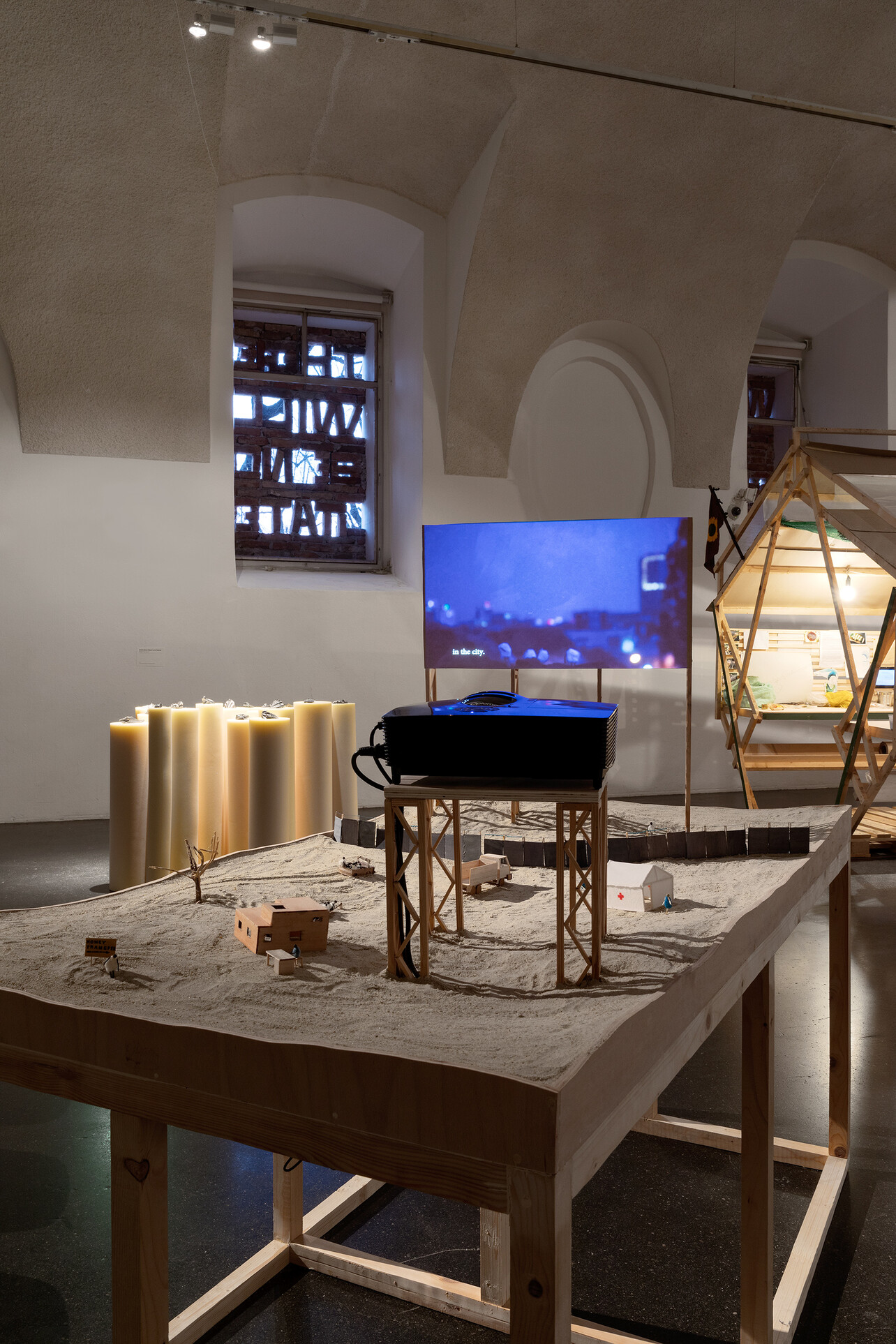 Die Arbeiten des slowakischen Künstlers Oto Hudec sind von persönlichen Erfahrungen, Sehnsüchten und Träumen geprägt, die er weiterentwickelt, um Themen wie Engagement für Mitmenschen und den Planeten, Nachhaltigkeit, Gemeinschaft, Austausch, Migration, das Leben und die Kultur der Roma sowie Achtung vor kulturellen Traditionen anzusprechen. Als Mitglied des internationalen Kreativteams „Make Art with Purpose“ glaubt er daran, dass Kunst „Gespräche oder kleine Aktionen“ anregen kann, die „Teil eines größeren Wandlungsschubs sind“. Seine Installation „Long, Long Road“ besteht aus einem Tisch, der mit Sand bedeckt ist, über dem ein Film auf eine Art großer Plakatwand projiziert wird. Sowohl Projektion als auch Projektor werden Teil der Landschaft, als Zeichen dafür, dass die Vorstellung einer leuchtenden Zukunft die treibende Kraft auf dem Weg des Migranten ist.