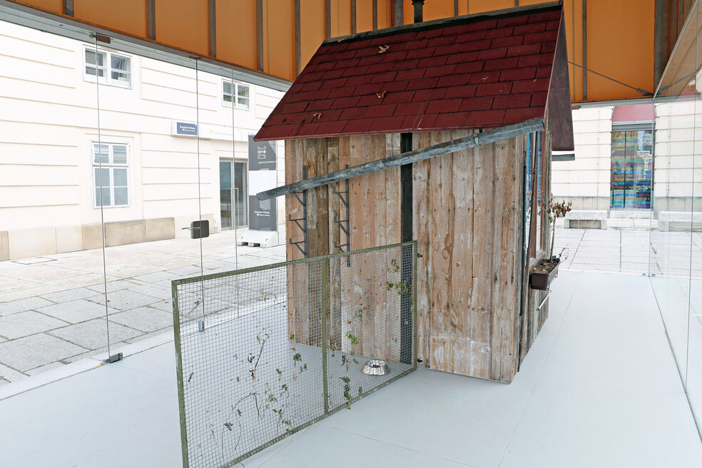 Alfredo Barsuglias Setting verweist sowohl auf ein museales Ausstellungsobjekt und dessen Bewahren in einer gläsernen Schauvitrine als auch auf eine Theaterkulisse. Über die zahlreichen Details, Requisiten und Ungereimtheiten lädt er die Betrachter:innen ein ihre eigenen Assoziationen zu finden. Vergangenheit, Gegenwart und Zukunft werden in diesem recycelten Gebäude verdichtet, das zwischen Realität und Fiktion über Materialien sowie Objekte vielerlei Geschichten erzählt. „Das letzte Haus“ scheint den letzten Menschen überlebt zu haben.