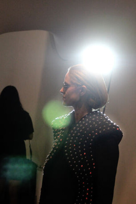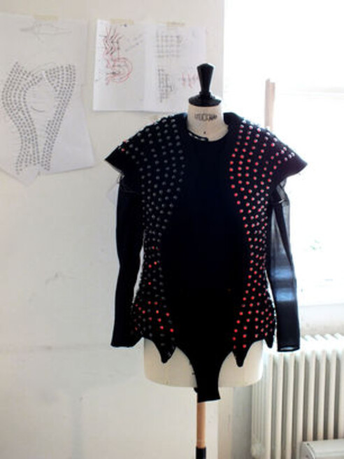 My aim for this project was to develop a piece of wearable technology with which I would investigate the undulating surface of the body. I wanted to further explore the idea of erosion, patterns, change and passing of time. As with my previous collection ‘Kinetic Landscapes’ I tried to capture the effect of wind and water on our surroundings and the unremarkable changes in nature which only after decades becomes visible. I started out from the idea that every action has a certain result or consequence; the concept of leaving an imprint after each intervention or a certain interaction and thereby creating an interesting topography on the body. Together with Daniel Schatzmayr [AT], electrical engineer/robot hacker, I developed an interactive garment, by using the principle of flip-dots. These dots are commonly used in a flip-dot display; an electromechanical dot matrix display technology used for large outdoor signs. The movement of these dots is reminiscent of waterfalls, a flock of birds in the sky or a school of fishes in the sea, swirling strata and lines of the earth's surface. I became fascinated by flip-dots because of the fact that they merge both analogue and digital technology. They have a physical presence and tactility, emphasized by their flickering sound, that nowadays digital technology often lacks.