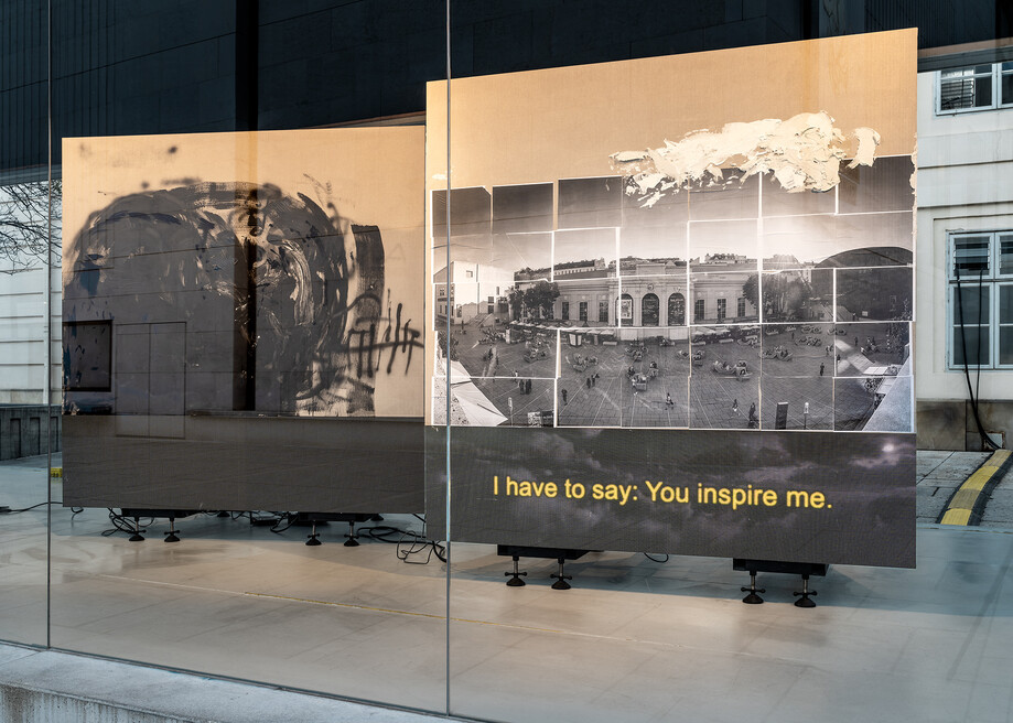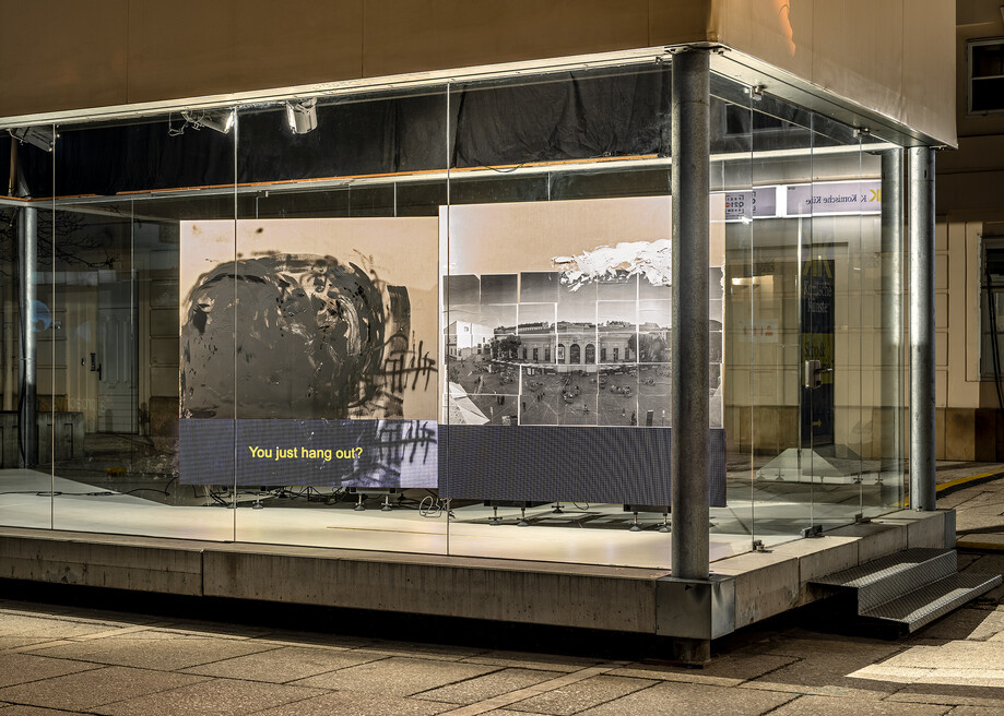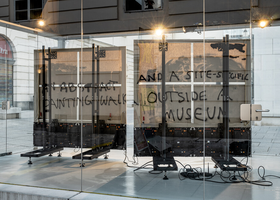 Es beginnt wie ein Witz. Ein abstraktes und ein ortsspezifisches Gemälde spazieren außerhalb eines Museums, so der übersetzte Titel von Philipp Timischls speziell für die MQ Art Box konzipierter Installation.