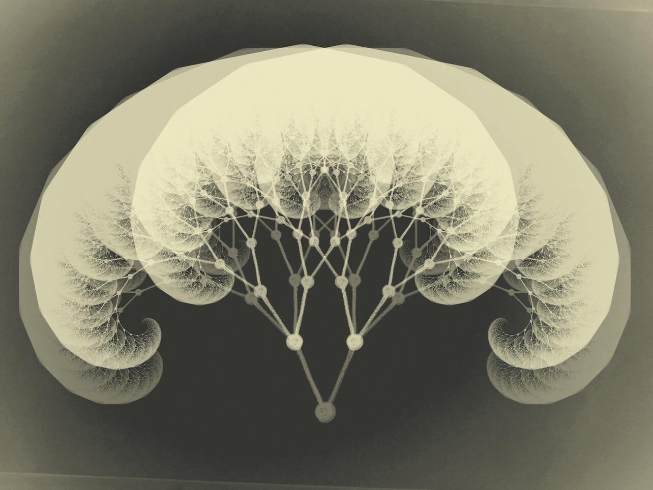 Das ist das Modell eines universellen Stammbaums. Alles Leben ist unfreiwillig Teil einer gigantischen Kettenreaktion, die bis zum Anbeginn des Lebens zurück reicht. Ich habe versucht das grafisch darzustellen. Du bist hier unten – der aktuelle Endpunkt, dann kommen deine Eltern, Großeltern, Urgroßeltern, Ururgroßeltern … das läuft immer so weiter, hinein in dieses Gewächs aus Vorfahren. Sobald du dich fortpflanzt, wächst du in dieses Objekt hinein. In der Jetztzeit bist du sichtbar als Punkt. Je weiter du hinein wächst, desto unsichtbarer wirst du. Du bist dann Teil einer Masse, die das alles aufgebaut hat, was heute ist.