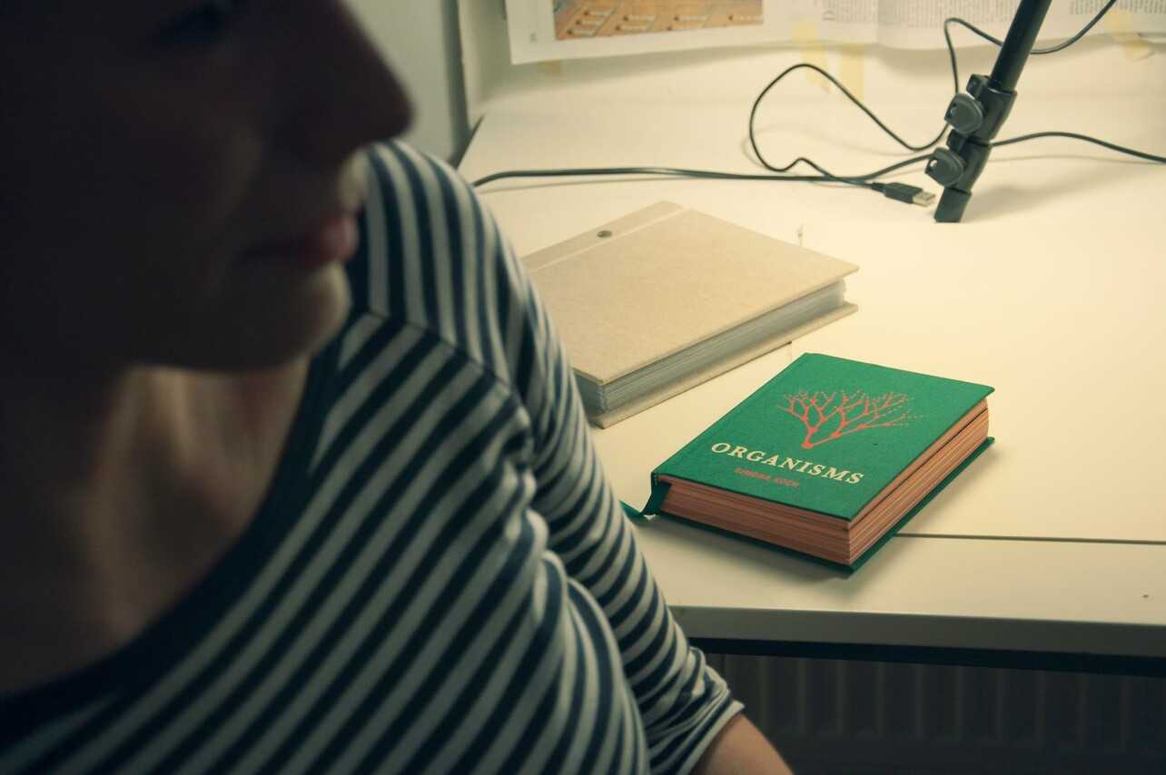 „Ich glaube dass alle Lebewesen aus den immer gleichen Bausteinen gebaut sind“, reagiert Simona auf mein Blättern in ihrem Buch ORGANISMS, das leinengrün auf dem Tisch liegt. „Es gibt Formen, die immer wieder auftauchen: Manche Tiere haben keine Knochen, dennoch haben sie Adern oder Haare und auf jeden Fall eine Öffnung. Alles hat eine Öffnung. Wir haben alle denselben Ursprung.“