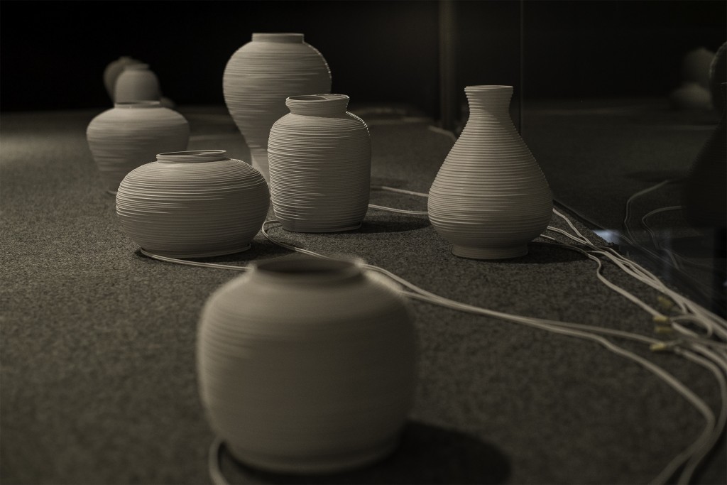 Zum Beispiel in meiner Arbeit „Koexistenz“, die aktuell hier in der Ausstellung „Connecting Sound Etc., Cable Works, Cable Sounds, Cables Everywhere“ im freiraum quartier21 INTERNATIONAL ausgestellt wird. Oder aber auch in meiner Arbeit „GULP! GULP! GULP!“. „Gulp“ ist ein onomatopoetisches Wort, das den Klang des Schluckens auf sprachlicher Ebene nachahmt. Für diese Installation habe ich Tassen aus Lautsprecherkabeln gewickelt. Die leeren Tassen fungieren primär als eine Metapher für den Durst der Menschen, sekundär symbolisieren sie ihre unstillbaren Wünsche und Sehnsüchte. Durch die Kombination dieser symbolbehafteten, aber leeren Objekte mit Klickgeräuschen wird uns signalisiert, dass diese Gefäße unsere Bedürfnisse nicht erfüllen können und unsere Wünsche vergeblich sein können. Wichtig in Bezug auf die Klänge ist, dass ich diese für meine Arbeiten nie neu produziere, sondern immer Aufnahmen von Klängen und Geräuschen mache, die bereits vorhanden sind, das heißt auch diese kommen aus dem Alltäglichen.