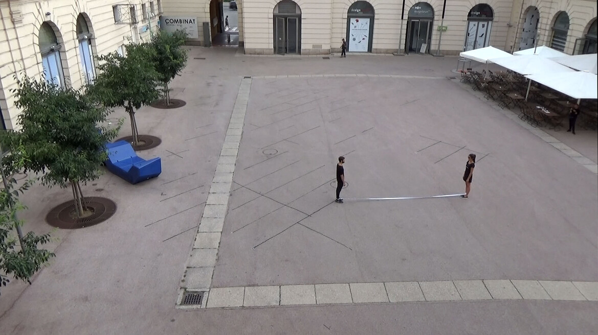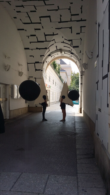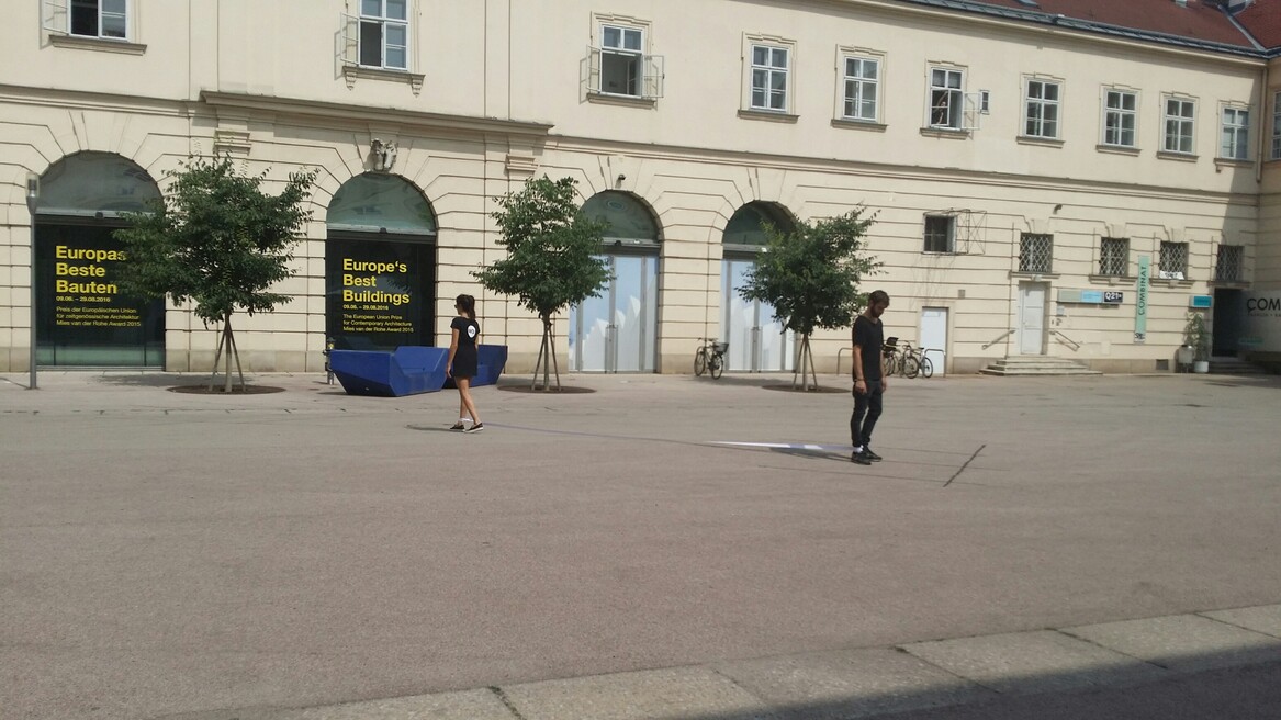 Cologni: Well, a residency at MuseumsQuartier means that there is a very specific institutional label on the space and on what is produced here. The spatial boundaries of this ‘quarter’ are set very well. There are doors and gates to get in and out. So you wonder what it might mean to produce and present something in the outdoor areas, the passage spaces of MuseumsQuartier. Would these interventions be ‘public’? Would anything presented here be perceived the same way if witnessed outside of these gates? Possibly audiences are aware of the performativity of their role within MQ, but punks, for instance, meet outside, and very few of them come through the gates and arches. Even when I am out here myself and my son Samuel wants to play with a ball I find myself telling him not to shout, as I would do in a museum… So what is social space, essentially? And is it necessarily public space at the same time? What is problematic or challenging about operating in institutionalised public spaces? By investigating such aspects I started thinking about the physicality, the practising body which contributes to space with its physical appearance and its physical spatial practices – practices in space, which Lefebvre defines as the perceived space. We contribute to the production of space by perceiving, which is an active practice in time and space – whether we are sitting silently on a bench or commuting on a bike, although we are rarely aware of it. But then space is conceived theoretically and abstractly by appointed people (planners, architects) with the mandate to dominate it by physically shaping the space we live in – the conceived space. So the space around – no matter if defined as public or not – is constrained, and we respond to it accordingly. MQ can be an interesting example and metaphor for this. Paradoxically, it is also a space ‘for’ art, an institution supporting creativity and investigation which operates within its own constraints.
