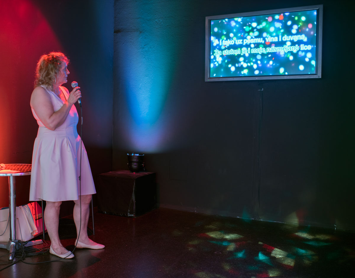 Die Dramatikerin und Dramaturgin Olga Dimitrijević öffnete im AJNHAJTCLUB ihre „JubiläumsKaraokebar“, in der das Publikum Lieder singen kann, deren Texte auf die Lebensgeschichten exjugoslawischer, in Wien lebender Frauen verschiedener Altersgruppen zurückgehen.