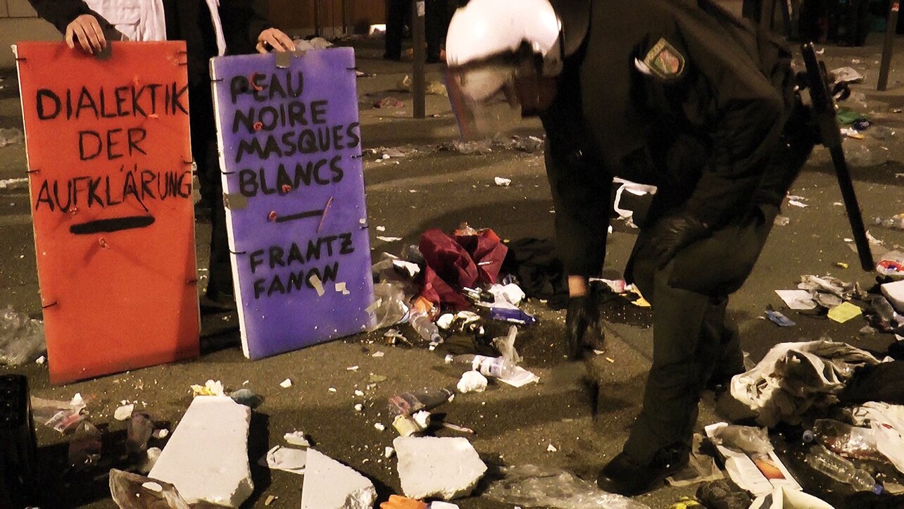 Specific configurations of power, which shape their own aesthetics, express themselves in concrete political conflicts. I find it fascinating to examine how these mostly antagonistic forms of expression develop, what functions they fulfil and how versatile they are. For my installation Red Carpet I used insignia of the aesthetics of dominance whose meanings are refracted by a decrypting form of intervention. The wall which is normally used to display logos and promote sponsors and patrons shows a video: You see uniformed police officers who seem to be searching for something in the light cast by their torches without orientation. They rifle through things left behind by people who were protesting the regime which deals with the European crisis and corralled by the police in Frankfurt am Main for more than ten hours. Styrofoam signs reading the book titles ‘Dialektik der Aufklärung’ (‘Dialectic of Enlightenment’) and ‘Peau Noire, Masques Blancs – Frantz Fanon’ (‘Black Skin, White Masks’) are being secured as evidence. In this situation the aesthetics of resistance thwart a bizarre action of state authority and develop their subversive potential.