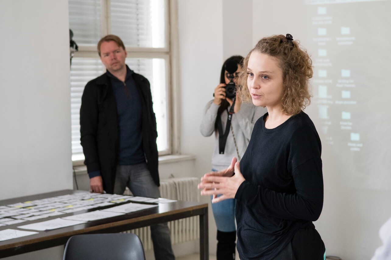 Marta Pajek is an independent author of animated films, connected to the Warsaw based Animoon Studio. During the studio visit, Marta shows her story-board which she developed partly during her residency in Vienna. It is part of an animated film triptych called 'Impossible Figures and Other Stories', which consists of three animated short films. They are based on the idea of an impossible figure – one which can be drawn according to all the rules of perspective but cannot be constructed in reality. Each of the stories describes such an impossible situation – simple at first, but filled with paradoxes and traps as we get deeper into it. At the MQ she developed the final part of a triptych, the storyboard, which was shown during the presentation alongside with design sketches.