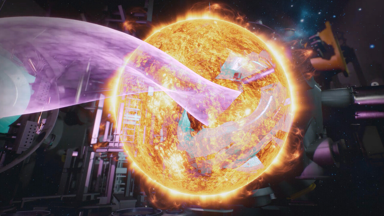 In meinen Filmen und Videoarbeiten spielt Ton normalerweise eine große Rolle: Er transportiert Emotionen, kreiert und untermauert Stimmungen. Daher habe ich zwei Versionen des Films gemacht – eine Version für den Raum D und eine für Screenings auf der Leinwand im Kino. Die Auseinandersetzung mit der Frage, wie ich die Inhalte ohne Ton transportiere, führte aber auch zu einem für mich fruchtbaren Prozess, wie das so häufig mit „Problemen“ ist. Ich entschied mich neben Untertiteln für meinen Interviewpartner, den Physikprofessor und Direktor des österreichischen Kernfusionsprogramms Prof. Dr. Aumayr, mit Texttafeln zu arbeiten, die zusätzliche Hintergrundinformationen liefern, wodurch die Arbeit in Teilen die Ästhetik eines Lehrfilms der 70er Jahre bekommt. Ich fand das sehr passend - Kernfusion ist schließlich kein Alltagsthema, mit dem wir uns alle auskennen. Und diese Ästhetik habe ich durch den Einsatz von klassischen Filmschnitten verstärkt, die man aus Science-Fiction Filmen aus den 70er und 80er Jahren wie beispielsweise Star Wars kennt. Ich wollte so die Zeitspanne von Forschung und Fortschritt, aber auch Misserfolgen und ständigen Erfolgserwartungen von der Vergangenheit bis ins heute einfangen. Es gibt in der Kernfusion diesen Running Gag: Vor 30 Jahren dachte man, dass die Kernfusion in 30 Jahren Realität wird. Und heute, 30 Jahre später, denkt man immer noch, dass sie in 30 Jahren kommt. Wir schieben die Kernfusion praktisch an der Spitze eines stabilen Zeitstrahls vor uns her, ohne ihr näher zu kommen. Man kann sagen wir erleben ein Déjà-vu, stecken also gewissermaßen in einer Zeitschleife.