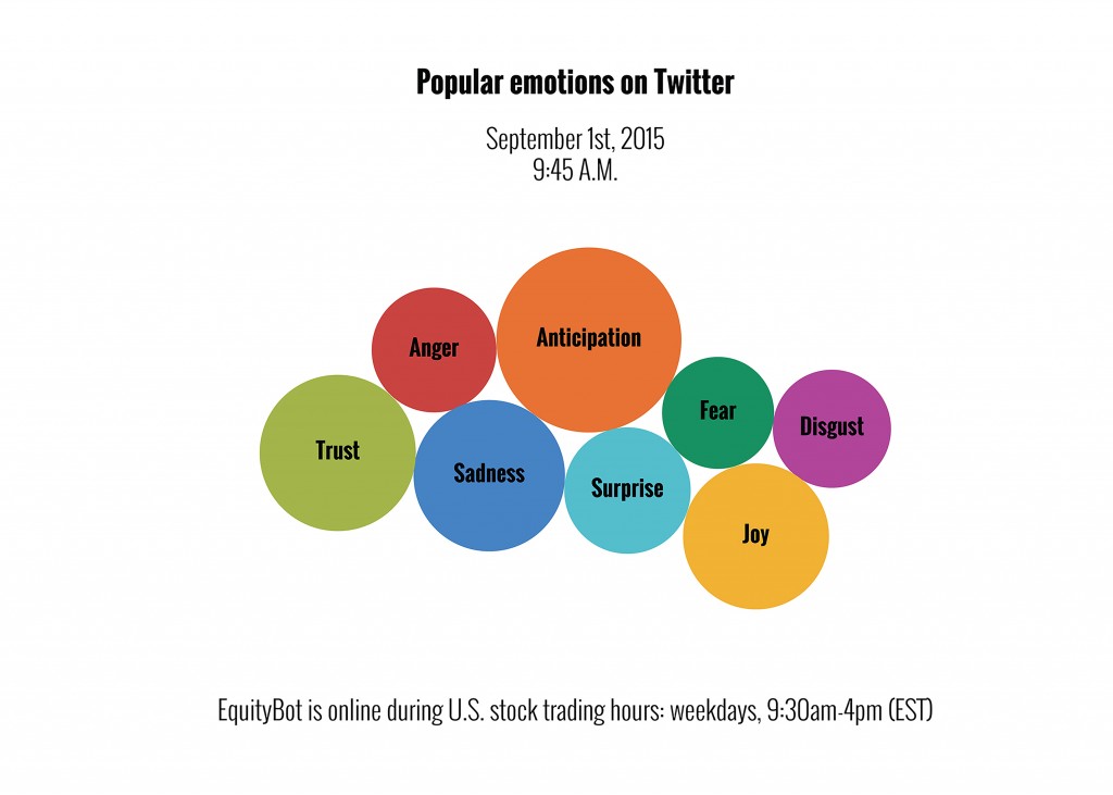 Scott Kildalls EquityBot simuliert einen Aktienhandelsalgorithmus, der in Emotionen wie Wut, Ekel, Freude und Erstaunen investiert. EquityBot wertet während der Börsenöffnungszeiten die auf Twitter verbreiteten Stimmungslagen aus. EquityBot verbindet diese Emotionen mit tatsächlichen Aktien und investiert über ein simuliertes Broker-Konto. EquityBot stellt ein automatisiertes System dar, das zeigt, welchen Einfluss Emotionen auf Handel und Kursverläufe haben, aber auch wie Emotionen zum Wertfaktor und zum Handelsobjekt werden.