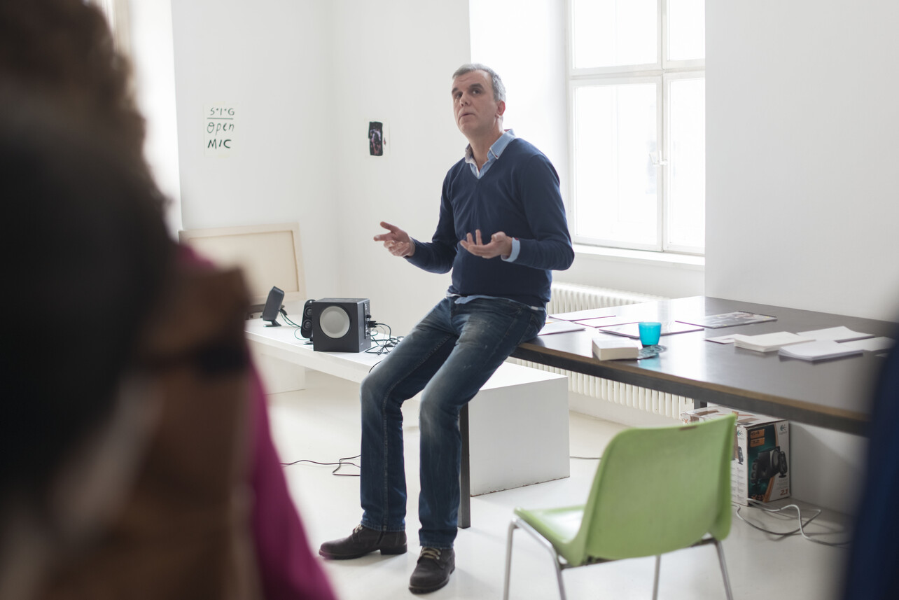 On Saturday during VIENNA ART WEEK, artist and cultural theorist Gerald Straub gave a guided visit of the Q21 Artist-in-Residence Studios. The current Artists-in-Residence presented their recent projects and showed their approach to arts and technology – from artistic practices that combine economics, design and media arts with philosophy of computation (Laura Lotti) to slowing down the process of publishing (Megan Francis Sullivan) to examining the human body as an electrochemical computer (Bill Seaman).