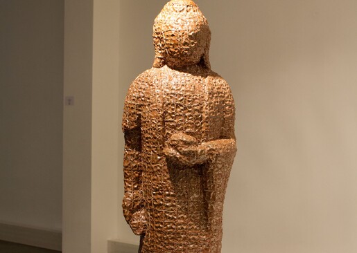 Die Porzellanskulpturen von Chen Shuo wiederum beziehen sich auf allgegenwärtige Elemente der chinesischen Kultur: Kriegerfiguren verschiedener Dynastien, Buddhas, Taihou-Steine und Pagoden. In der Ausstellung steht ein Buddha in seiner formalen Klarheit einem Bild von Karin Pliem gegenüber, das in seiner Feinstruktur aus Blüten, Gewächsen und skulpturalen Elementen der klaren Einfachheit Chen Shuos kontert. Seine Objekte werden in einem aufwändigen Prozess zu menschengroßen Figuren aufgebaut. Um die Formen in die Härte von Porzellan verwandeln zu können, zerschneidet er diese in hunderte Einzelteile, um sie nach dem Brennen und Glasieren wieder mit Metalldraht zusammenzufügen. Wie in He Weis Bildern ist die Struktur jeder Skulptur demnach schon von Anfang an klar, wird während des Arbeitsprozesses jedoch wieder aufgelöst, um in leicht veränderter Form vollendet zu werden.