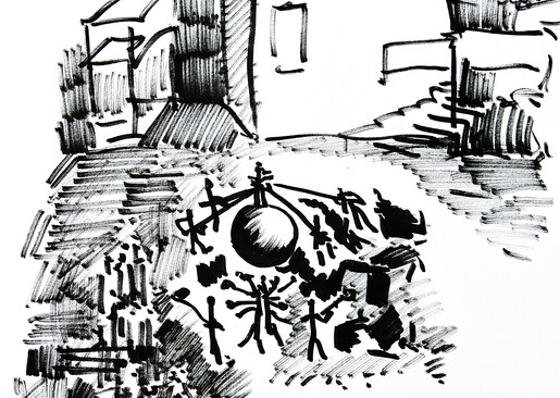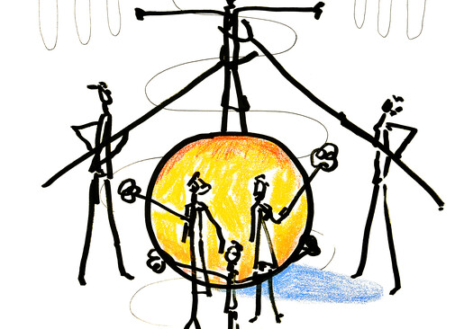 Ein kosmologisches Theater zur Sommersonnenwende, eine rituelle Inszenierung, ein Erd-Drama, ein Aufbrausen von Tönen, Atmosphären und Lichtern. Die rollende Kugel projiziert sich auf den kollektiven Korpus, der die Kleinerde durch den zur Himmelsarena transformierten MQ Hof rollt, eskortiert vom Teppichklopferballett als sublime Mensch-Maschine. Es geht um die fragile Balance, den vorschlagsweisen Zustand, um Auskunft, Ankunft und Zukunft, um ein Frage- und Antwort-Spiel auf und mit der Erde. Die Orakelkugel wird ihrerseits umrollt und umkreist, berührt, betanzt und besungen. Eine Allegorie der irdischen Existenz in Gestalt eines Gefährts mit Gefährt:innen.