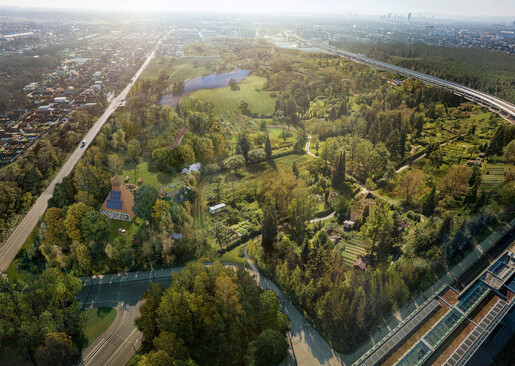 Einer dokumentarischen Luftaufnahme, die das von Aktivist*innen besetzte Baugelände als große Stadtbrache oder -wüste zeigt, setzt Ressler kontrapunktisch die eindrucksvolle fotogenerierte Montage einer klimagerechten Renaturierung, eine Landschaft mit Wald, See sowie landwirtschaftlicher Nutzfläche entgegen.