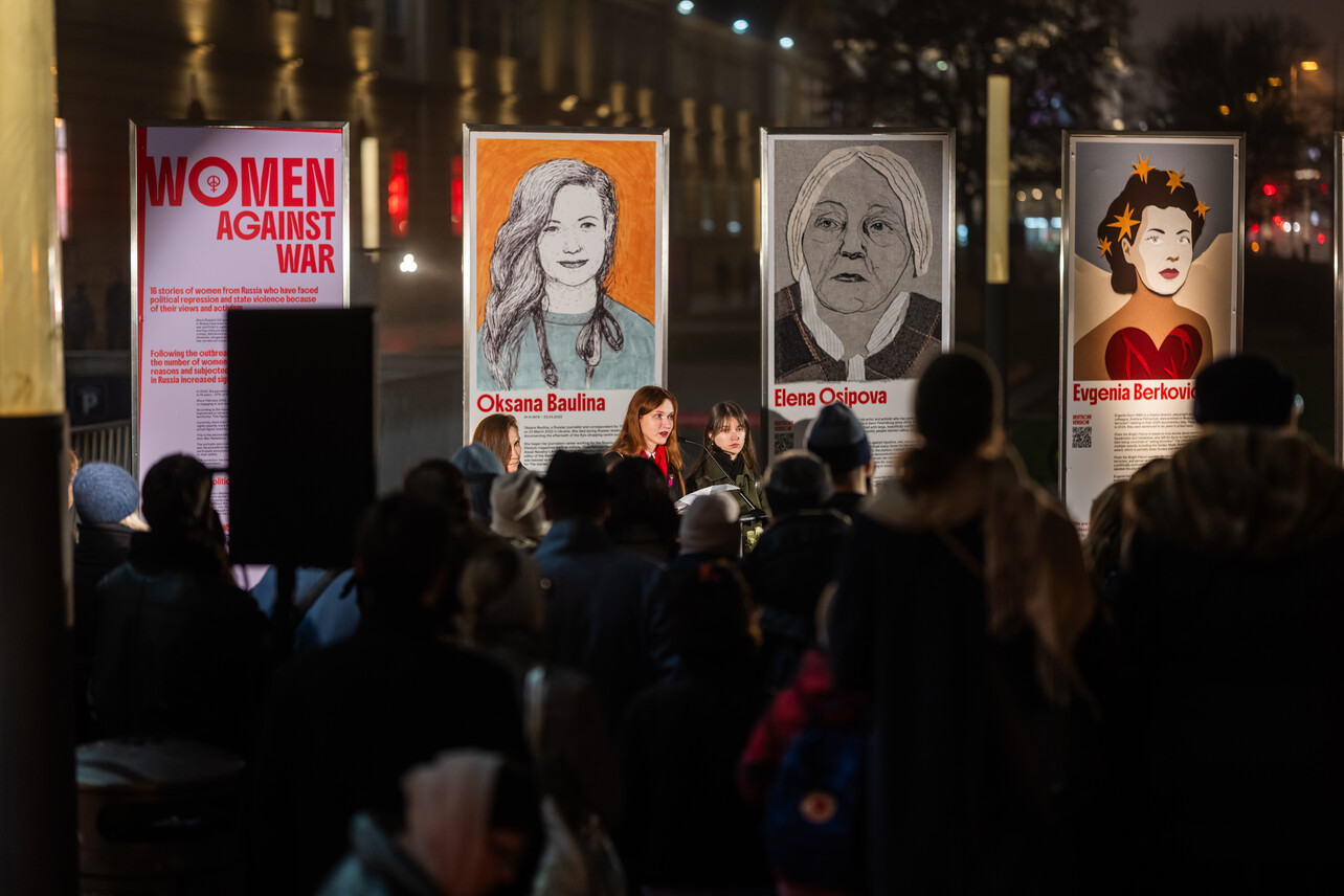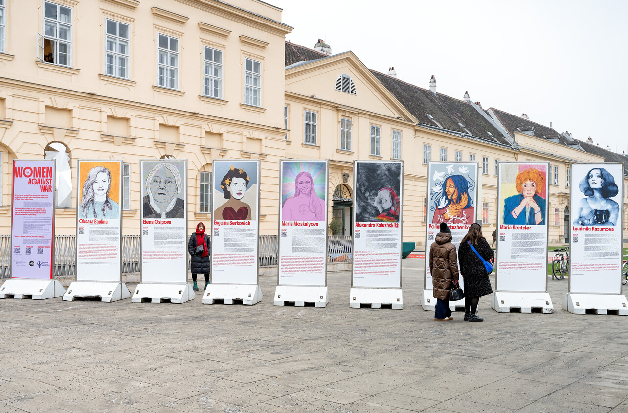 Die Installation „WOMEN AGAINST WAR“ gibt Einblicke in 16 Lebensgeschichten von Frauen in Russland, die aufgrund ihrer politischen Überzeugungen und ihres Aktivismus Repression und staatlicher Gewalt ausgesetzt sind. Jede dieser Frauen wurde von einer russischen Künstlerin porträtiert, von denen die meisten anonym bleiben müssen, um ihre Sicherheit nicht zu gefährden. Unter ihnen ist Daria Apakhonchich, sie porträtierte die Journalistin Oksana Baulina, die bei einem Raketenangriff in Kiew ums Leben kam. Ebenfalls am Projekt beteiligt ist die multidisziplinäre Künstlerin Alisa Gorshenina. Zu ihren wichtigsten Ausdrucksformen zählen Textilkunst, Zeichnung, Malerei, Fotografie und Video. Seit 2022 sieht sie sich aufgrund ihrer anti-kriegsorientierten Haltung wiederholt Bedrohungen und politischer Repression ausgesetzt. Alexandra Skochilenko, Aktivistin, Musikerin und Schriftstellerin aus Sankt Petersburg, ist nach ihrer Freilassung im Rahmen des Gefangenenaustauschs 2024 erstmals als Künstlerin an der Installation teilnehmend und zeigt ein Porträt von Nadin Geisler, die in Russland zu einer der längsten Haftstrafen für politische Gefangene verurteilt wurde. Die Texte spiegeln ausschließlich die Meinungen der am Projekt beteiligten Künstler:innen und Kurator:innen wider.