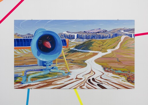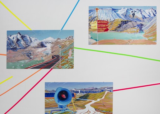 In „Planettoo“ (07.03 bis 26.05.) wirft die österreichische Künstlerin Anna Meyer mit einer Auswahl ihrer Gemälde einen kritischen, dezidiert feministischen, humorvollen aber auch schmerzlichen Blick auf die österreichischen Gebirgslandschaften. Ausgehend von einer verdichteten Präsentation im MQ Pop-Up Schauraum verästeln sich die Gemälde mittels farbiger Klebstreifen nach außen und erobern den öffentlichen Raum.