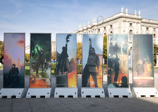 Auf Einladung des MuseumsQuartier Wien hat Hoda Afshar deshalb genau diese symbolstarken Bilder aus den sozialen Medien ausgewählt, um sie für eine breite Öffentlichkeit sichtbar zu machen. Sechs Aufsteller mit mehr als zwei Meter großen Fotoansichten bilden die Installation, die im öffentlichen Raum am Vorplatz des MuseumsQuartier Wien zu sehen ist.