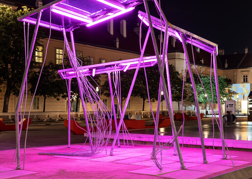 Judith Fegerl setzt sich in ihrer künstlerischen Arbeit mit der Sichtbarmachung von Energie auseinander. Für das MQ entwarf sie eine Skulptur aus Photovoltaikmodulen, Stahl, Lichtkörpern und elektronischen Komponenten. Tagsüber wandelt „converter“ Sonnenenergie in elektrische Energie um und speist diese ins Stromnetz ein.