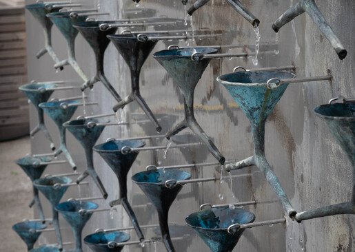 Das Wasser, das im Brunnen fließt, teilt sich durch die vielen Bronzetrichter in immer kleinere Mengen auf, bis es fast vollständig aufgebraucht ist. Heute symbolisiert das Werk die Verknappung natürlicher Ressourcen, aber auch die Schwächung der Demokratie. Es ist ein Werk das für Fragen globaler, ökologischer, aber euch individueller Erschöpfung sensibilisiert und den Zustand der Welt reflektiert.