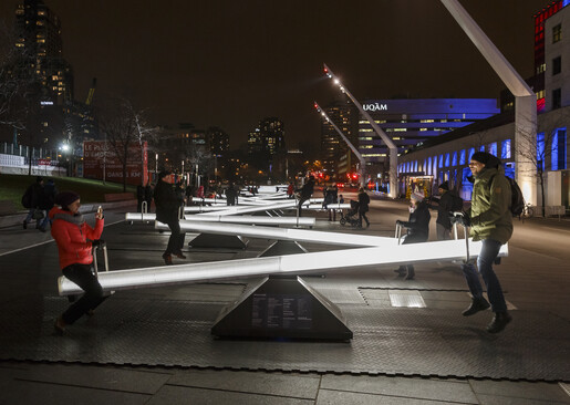 Von 09.12. bis 09.01. wird dann „Impulse“ im MQ Haupthof für Licht- und Klangerlebnisse der besonderen Art sorgen: „Impulse“, kreiert von Lateral Office & CS Design und präsentiert in Zusammenarbeit mit Creos, nutzt die Idee sich wiederholender Einheiten, um durch Wiederholung und Variation ein sich ständig veränderndes Ereignis zu schaffen. Die Installation besteht aus einer Reihe interaktiver, beleuchteter Wippen, die reagieren und sich verwandeln, wenn sie von Menschen in Bewegung gesetzt werden: Sind die Wippen im Ruhezustand, verbleiben diese mit niedrigem Beleuchtungsgrad auf einer horizontalen Ebene. Sobald die Wippen von den Benutzer*innen aktiviert und geneigt werden, erhöht sich die Lichtintensität, ergänzt durch das Abspielen einer zufälligen Tonfolge, wodurch die Benutzer*innen selbst zu Musiker*innen und Künstler*innen werden. („Impulse“ – Production: Partenariat du Quartier des spectacles, Montréal, Kanada; Creation and execution: Lateral Office and CS Design; Collaborateurs: EGP Group, Mitchel Akiyama, Générique Design, Robocut Studio)