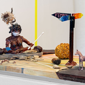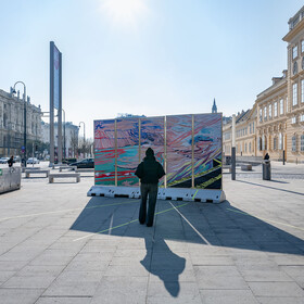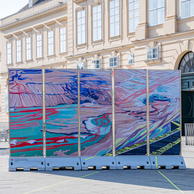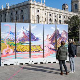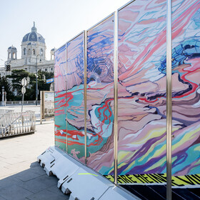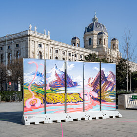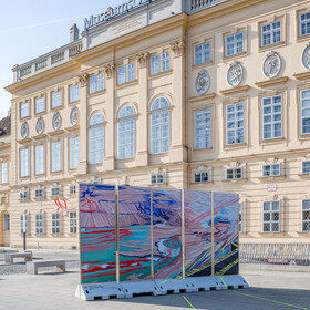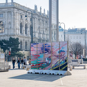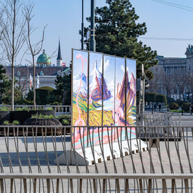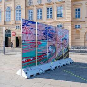Am Vorplatz des Areals werden zwei der Werke prominent und großformatig auf dem sechs fünf doppelseitige Stelen umfassenden Display präsentiert – Anna Meyers ökofeministischer (Aus-)Blick empfängt die Besucher:innen im MuseumsQuartier.