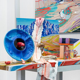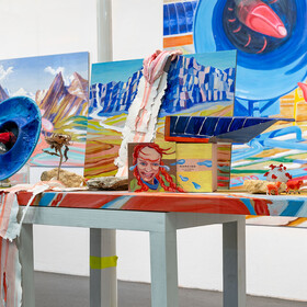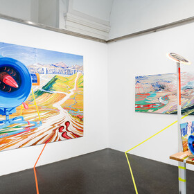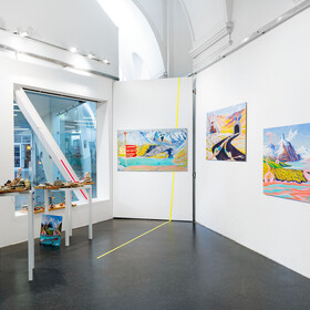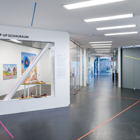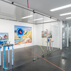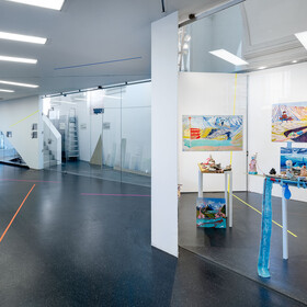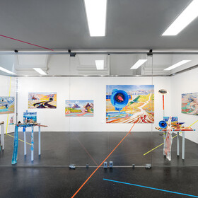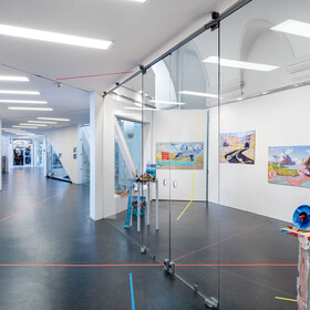 Ausgehend von einer verdichteten Präsentation im MQ Pop-Up Schauraum erobern die Gemälde und Objektarrangements sich Raum, verästeln sich in Form von farbigen Klebstreifen in die Gänge der MQ Schauräume und bis zum Haupteingang des MuseumsQuartiers; zugleich leiten diese Markierungen die Besucher:innen direkt in die Bilder hinein.