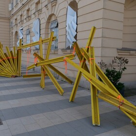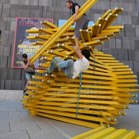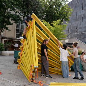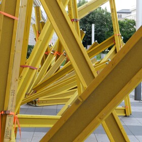 Rainer Prohaska, Künstler und Gründer des Futurama Lab, wird über einen Zeitraum von einer Woche mit seinem Team und unter Einbeziehung von Besucher:innen mit einer Skulptur-Performance am Areal des MuseumsQuartiers präsent sein. Mehrere hundert Stück von standardisierten VT20-Schalungsträgern aus der Baubranche werden während der Dauer der Aktion von den Teilnehmer:innen immer wieder neu arrangiert, gestapelt, geschlichtet, auf- und abgebaut. Die skulpturale Anordnung ist in ständigem Wandel. Die gelben Holzelemente haben eine Länge von je 245 cm und werden ohne Zuhilfenahme von elektrischen Geräten bewegt. Tragen, Heben, Stellen und Sichern werden als kollaborative Tätigkeiten durchgeführt und lassen verschiedene skulpturale Figuren entstehen. Wesentlich bei dieser künstlerischen Aktion ist nicht eine definitive Form, sondern das Experiment, der Arbeitsprozess und die Kooperation.