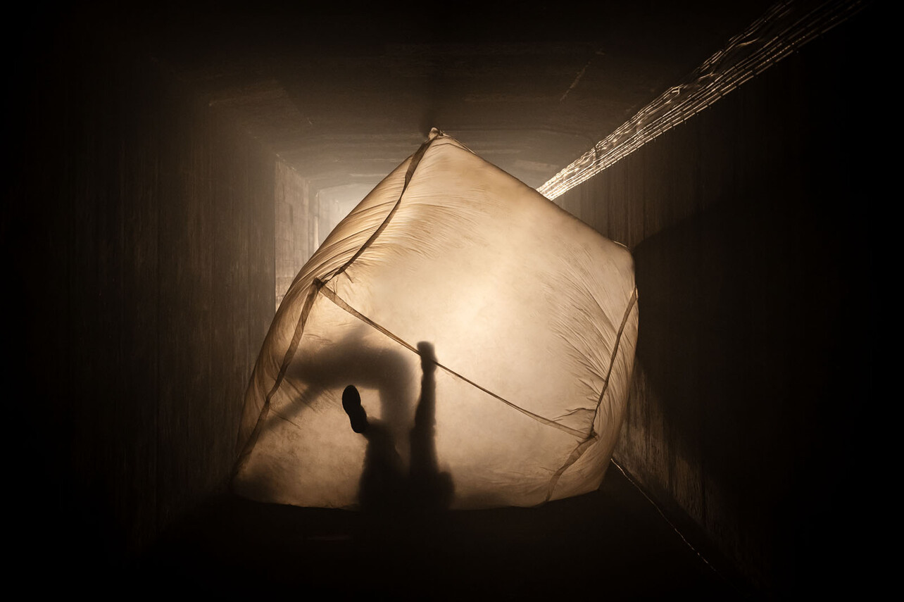 Die Installation besteht aus vier breiten Bahnen aus Skizzenpapier, die am oberen Ende an einer Holzlatte fixiert und jeweils mit einem an der Decke montierten Rotationsmotor verbunden sind. Die durchscheinenden Papierbahnen bewegen sich langsam, ähnlich einem Mobile, vollführen eine Performance subtiler Bewegungen, die im Wechsel offene und geschlossene Raumstrukturen bilden. Durch das allmähliche Öffnen und Schließen befindet sich der Raum in ständiger Verwandlung, fordert die Betrachter:innen auf, sich durch diese temporären Räume der Inklusion und Exklusion und die von den Tafeln geschaffenen Korridore als Zonen des „Dazwischen“ zu bewegen. Sound wird als zentrales Element der atmosphärischen Gestaltung eingesetzt, und Lichteffekte begleiten und choreografieren die Szenenwechsel. Die Papierbahnen und die spiegelfolierten Wände werden mit Rauchbildern bespielt, die Objekte, Raum und Betrachter:innen miteinander verbinden und interagieren lassen.